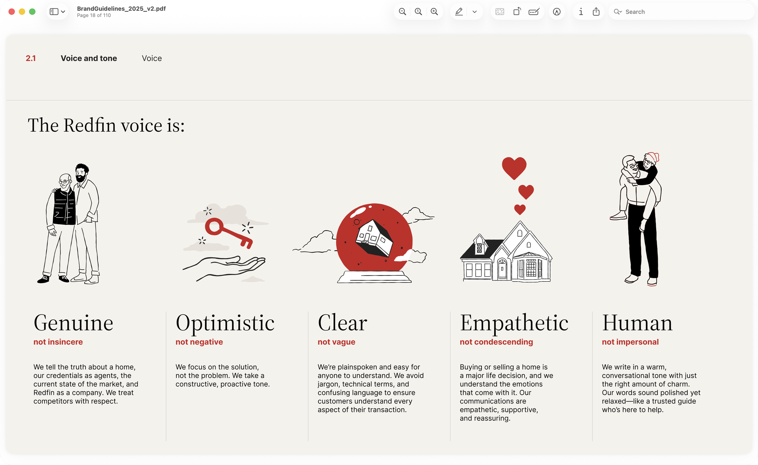 I oversaw all aspects of the Redfin brand: design, tone of voice, illustration systems, photography styles, and more. Here’s a link to the full brand guidelines, if comprehensiveness is your thing.